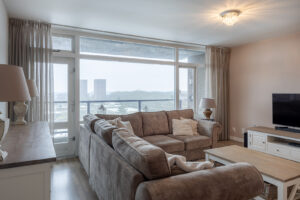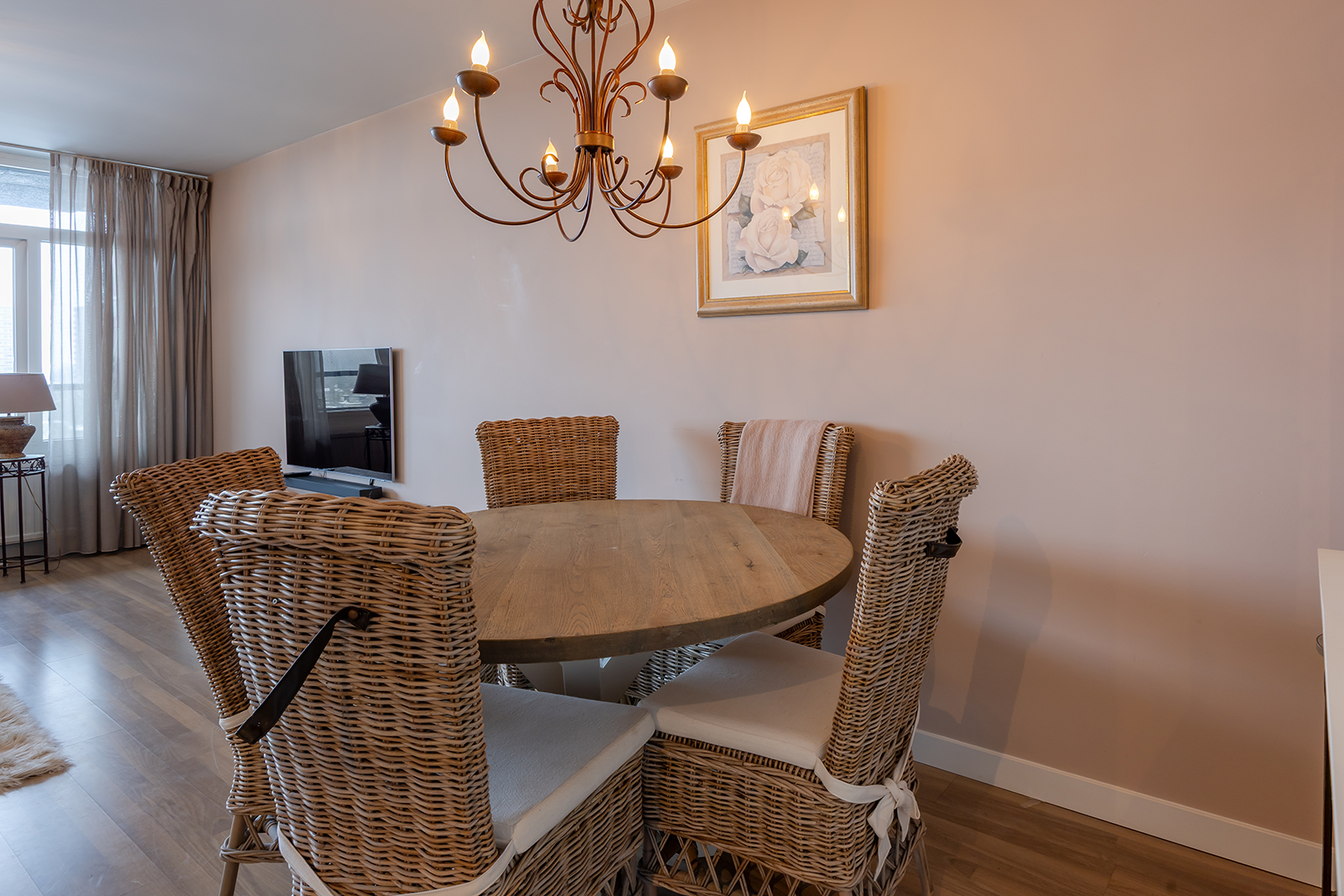 Woonkamer met grote raampartij waardoor veel natuurlijke lichtinval word gecreëerd. De wanden zijn voorzien van glad stucwerk en het plafond is eveneens voorzien van glad stucwerk. Op de vloer ligt een lichte laminaat (2017) volledig doorgelegd in het gehele appartement m.u.v. badkamer en toilet.
