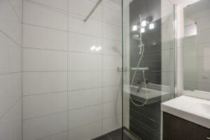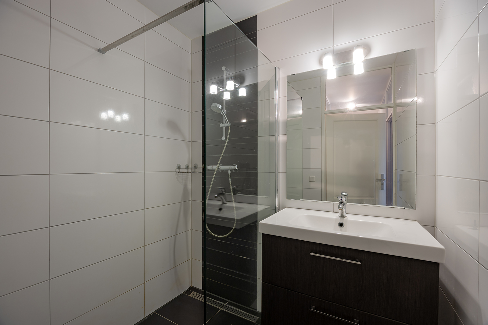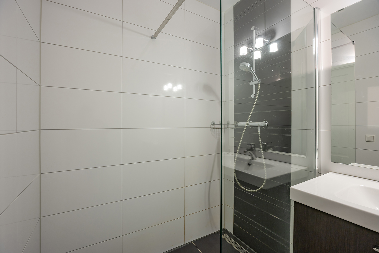 Volledig betegelde moderne badkamer met inloopdouche, wastafel met badmeubel en designradiator. Lichte kleuren sanitair en tegelwerk.