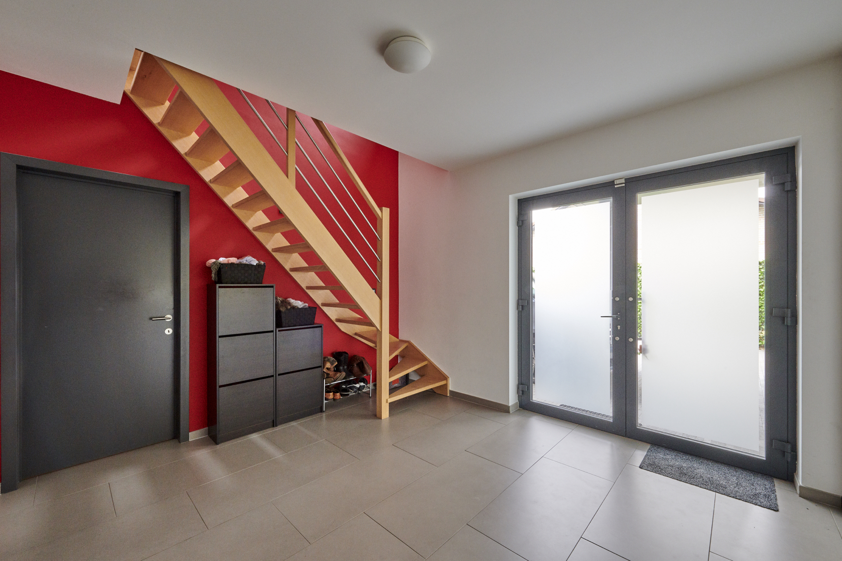 Zeer ruimte ontvangsthal volledig betegelde toiletruimte met inbouwcloset en fonteintje. Luxe sanitair en tegelwerk.