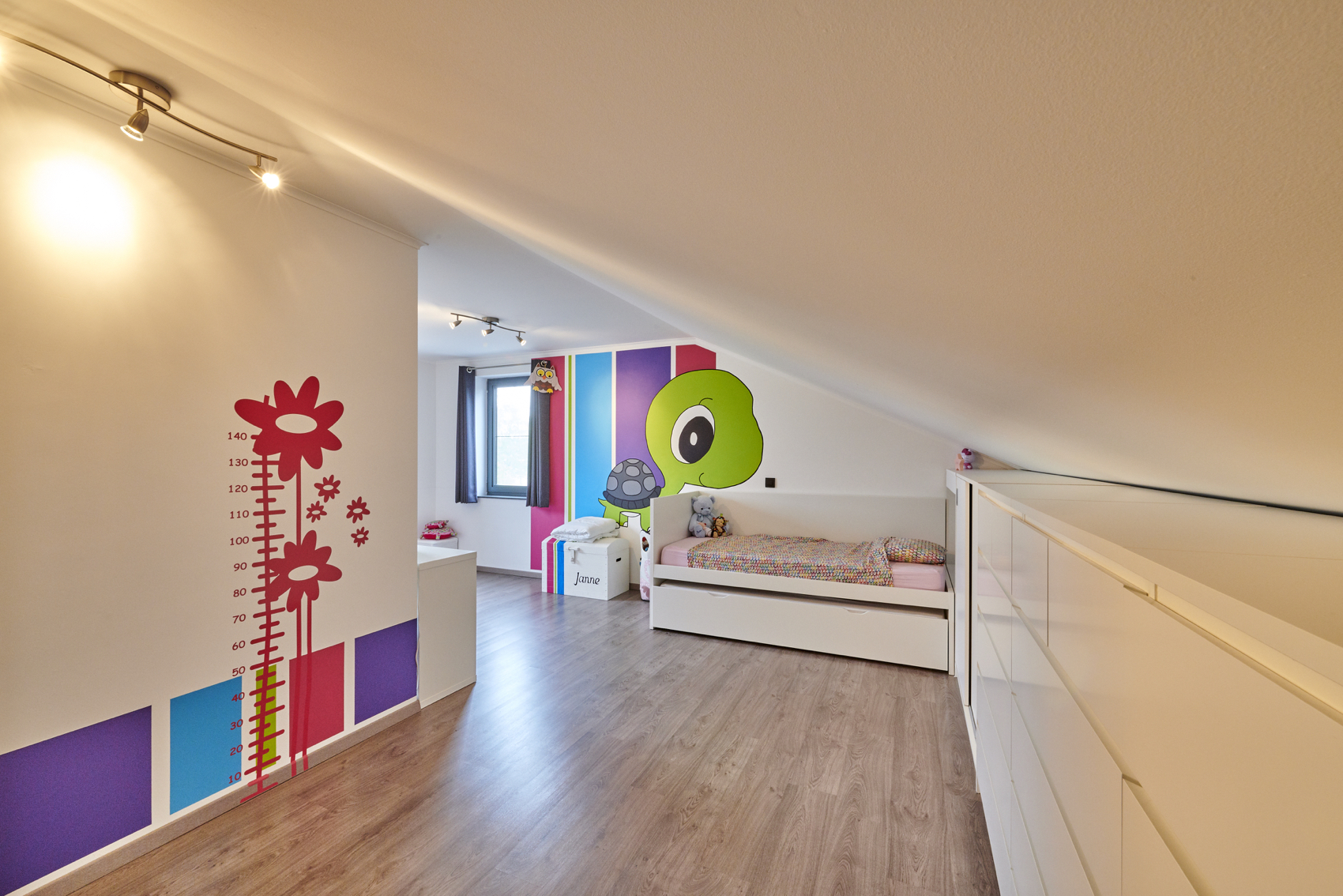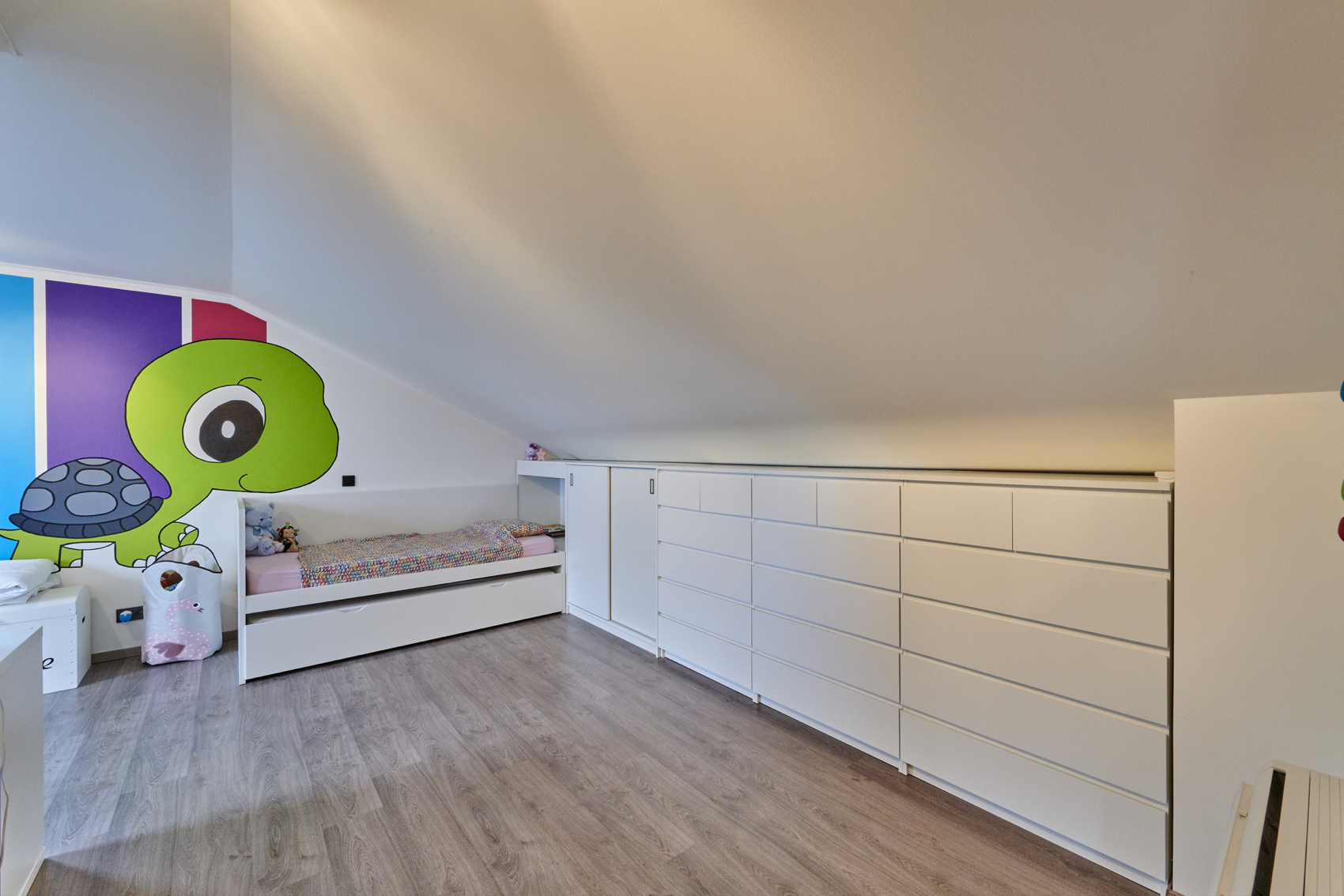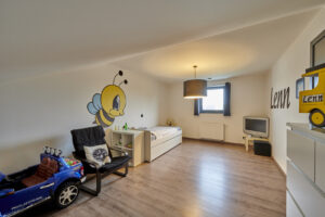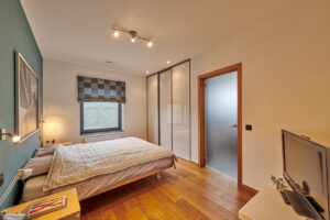 Deur naar slaapkamer met vaste inbouwkast met hang- en leg mogelijkheden welke is voorzien van schuifdeuren. De slaapkamer is voorzien van gladde stucwerk wanden en glad gestukadoord plafond met inbouwspots. De Vloer is voorzien van massief eiken planken.