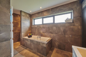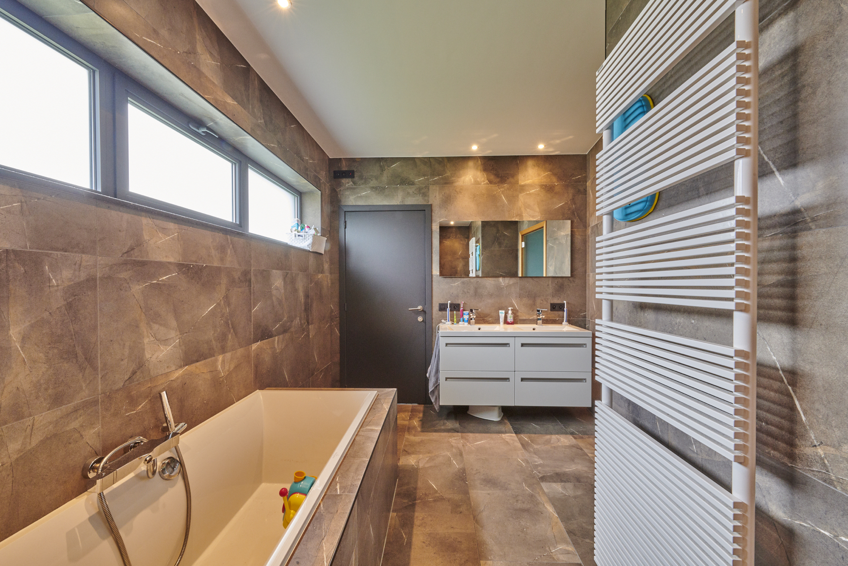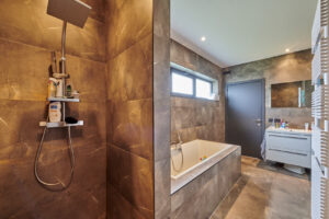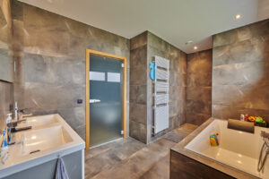 En suite aan de slaapkamer, doch afsluitbaar, een moderne luxe badkamer met dubbele wastafel met badmeubel, ligbad en een inloopdouche met regendouche.