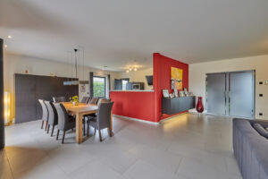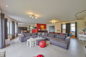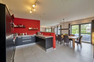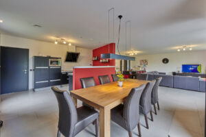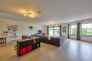 Zeer riante woonkamer voorzien van een lichte tegelvloer met vloerverwarming. Een schuifpui geeft toegang tot de achtertuin. De woonkamer is keurig afgewerkt met gladde stucwerk wanden en stucwerk plafond met inbouwspots.