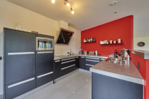 Gezellige open eetkeuken met moderne U vorm keukeninrichting voorzien van een kunststof werkblad en diverse apparatuur zoals: vaatwasmachine, combi-oven/magnetron, keramische kookplaat, afzuigkap en koelkast.