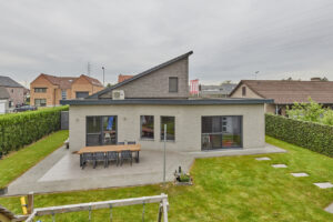 Volledig omheinde achtertuin met gazon en terras. De tuin is voorzien van een vrije achterom met afsluitbare poort.