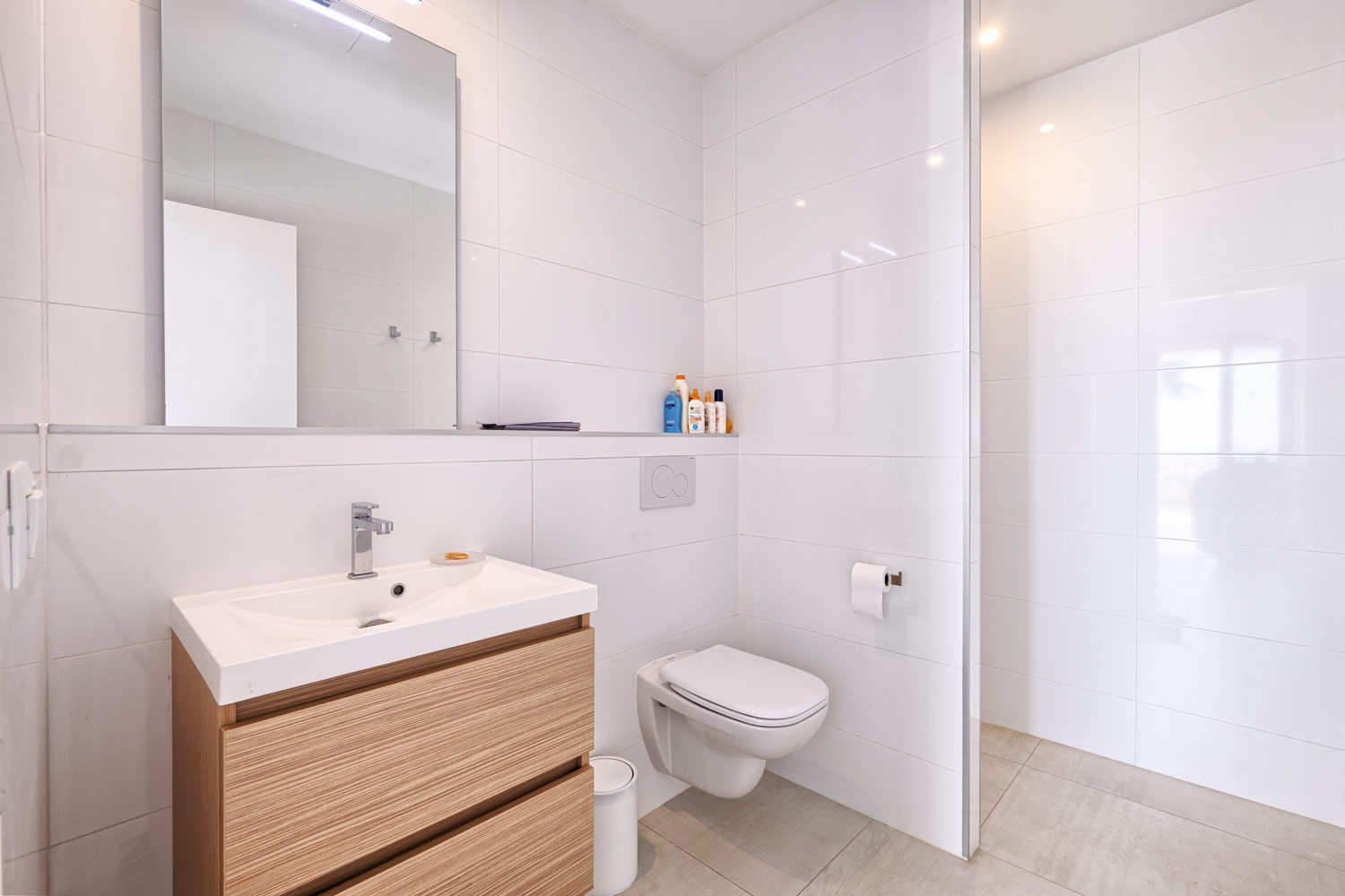 Eerste ruime masterbedroom op begane grond met en-suite luxe badkamer en separaat toilet. Vanuit deze kamer is er rechtstreeks toegang tot het overdekte terras met tuin en zwembad.