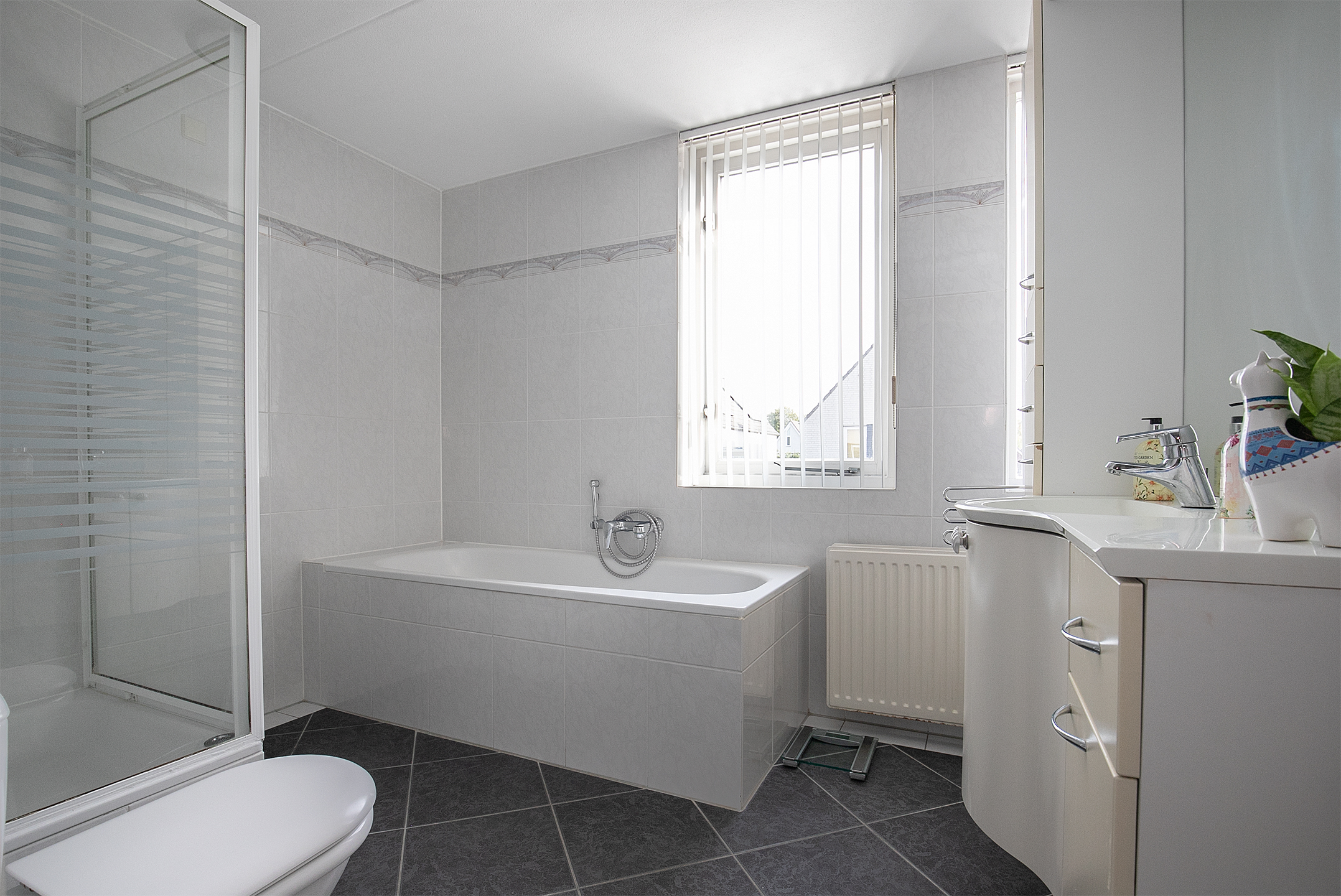 De badkamer is uitgevoerd met een douchecabine voorzien van een thermostaatkraan, een ligbad voorzien van een mengkraan, een tweede zwevend toilet en een vaste wastafel met meubel.