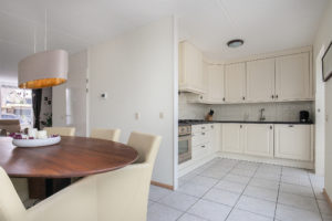 De keuken staat in open verbinding met de woonkamer en is tevens voorzien van een tegelvloer met vloerverwarming. De keuken is geplaatst in een hoekopstelling en is afgewerkt met een kunststof inrichting en aanrechtblad met een RVS spoelbak. De inbouwapparatuur bestaat uit onder andere een 6-pits gaskookplaat, een afzuigkap, een oven en een vaatwasser.