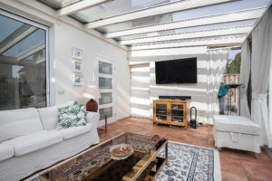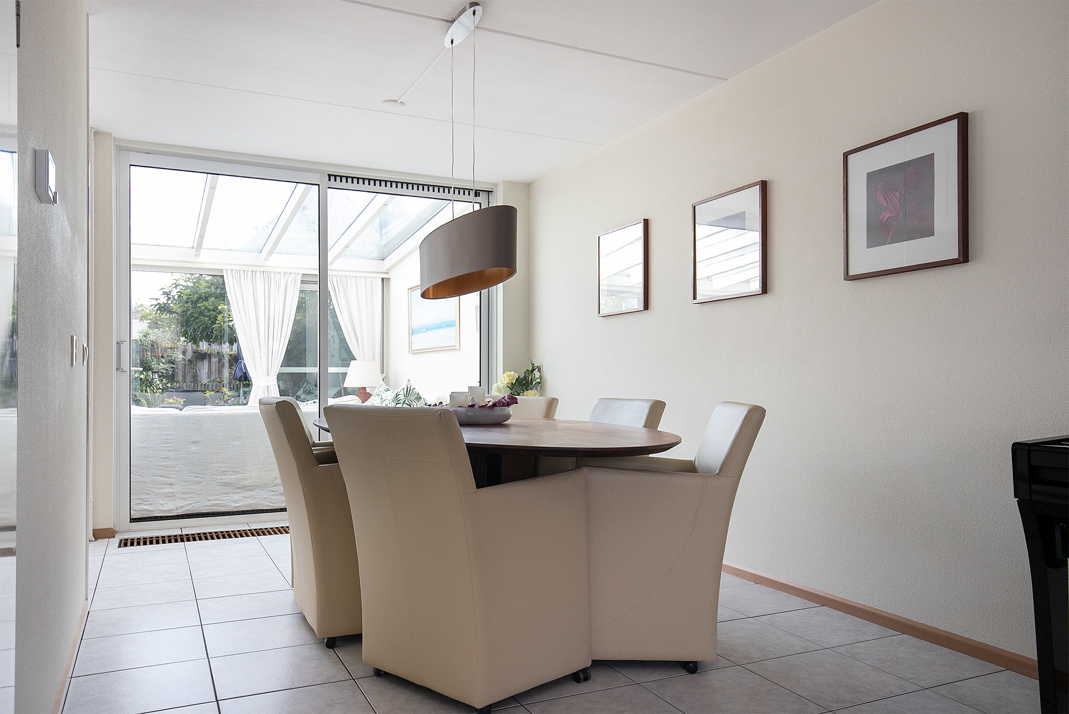 Aan de achterzijde van de woning heeft u de beschikking over een fraaie aluminium serre (2004). In deze ramen zit HR beglazing en voor de ramen zijn elektrische screens aanwezig. In de serre is een praktische tegelvloer voorzien van vloerverwarming aanwezig. In het plafond bevinden zich handige inbouwspots. Via een tweetal schuifpuien is de achtertuin te bereiken.