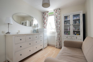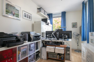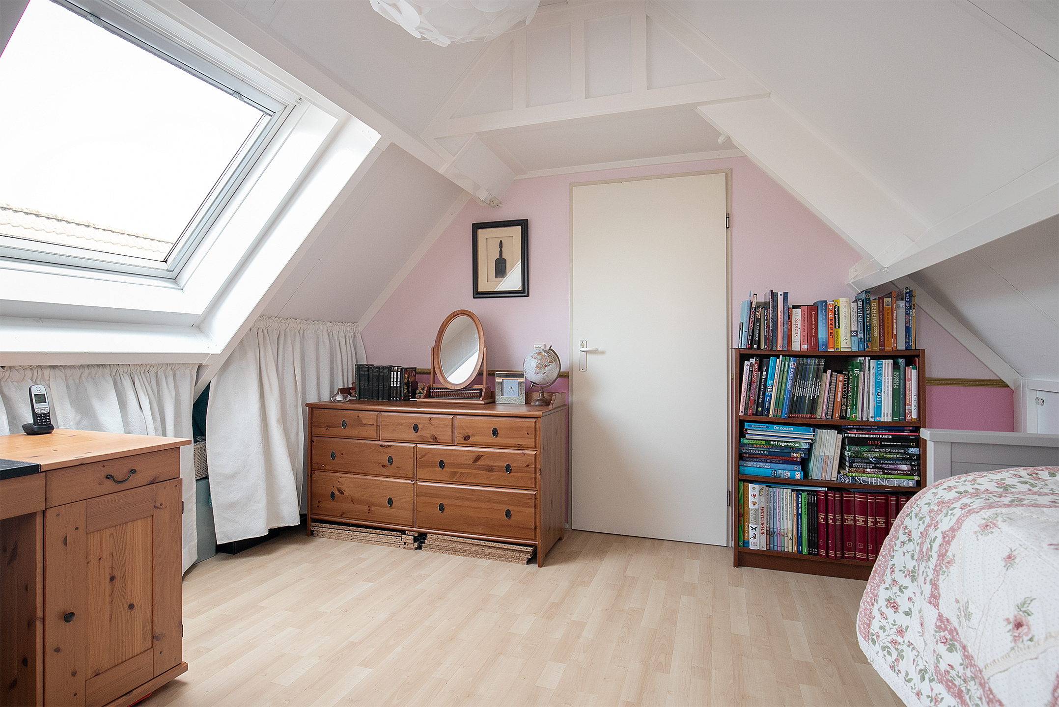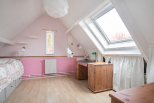 De vierde slaapkamer is tevens afgewerkt met een laminaatvloer en texwerk wanden. Een radiator zorgt voor de benodigde warmte en achter de knieschotten is voldoende bergruimte aanwezig. Een ruim dakraam zorgt voor de natuurlijke lichtinval.