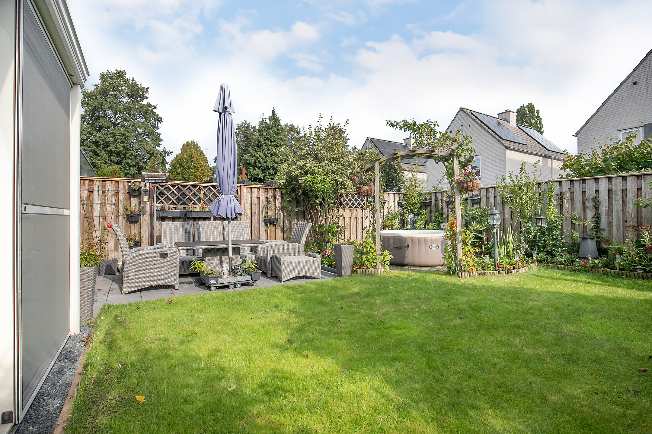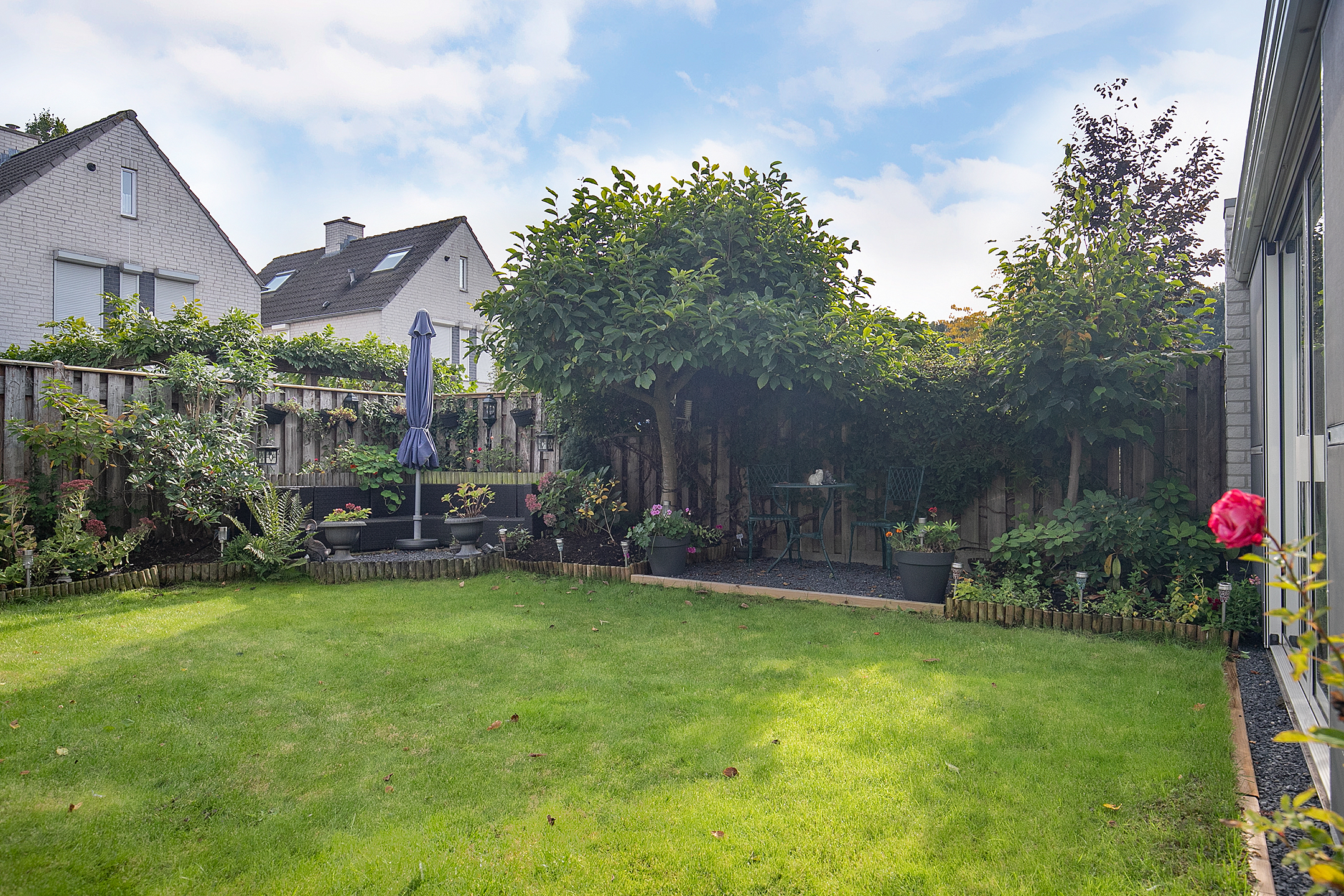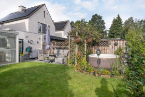 Volledig omheinde achtertuin met een terras en diverse borders voorzien van vaste beplantingen. Tevens heeft u hier ook de beschikking over een praktische buitenkraan en buitenverlichting.