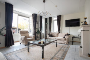 De ruime woonkamer (L-vormig) is voorzien van grote raampartijen aan zowel de voor- als achterzijde van de woning. De woonkamer met sfeervolle erker aan de voorzijde is afgewerkt met een tegelvloer voorzien van vloerverwarming, spuitwerk wanden en een spuitwerk plafond. Een gashaard zorgt voor extra sfeer en warmte.