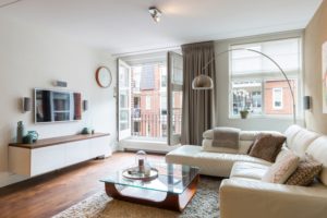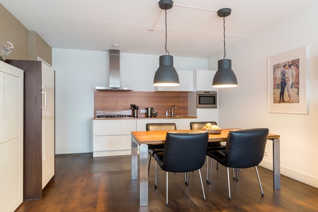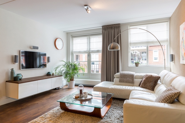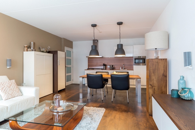 Moderne, frisse woonkamer voorzien van een laminaat houten vloer met 6 mm eiken toplaag (doorgelegd in nagenoeg het gehele appartement met uitzondering van keuken, badkamer en toilet) Wanden uitgevoerd in spachtelputz en plafond voorzien van spuitwerk. De grote raampartij (draai-kiepraam) aan de voorzijde van de woonkamer zorgt voor veel lichtinval!