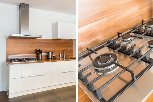 Open keuken met een moderne zwarte tegelvloer, witte hoogglans keukeninrichting met kunststof werkblad (hout-look) en subtiele rvs handgrepen. De keuken is voorzien van apparatuur zoals: rvs afzuigkap, gaskookplaat met wokbrander, vaatwasser, koelkast en combi magnetron.