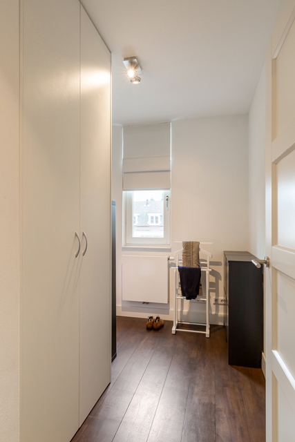 1e slaapkamer c.q. hobbykamer met vaste kast (ter overname) waarin verwerkt de wasmachine en droger. De slaapkamer is afgewerkt met en spuitwerk plafond en wanden voorzien van structuurverf.