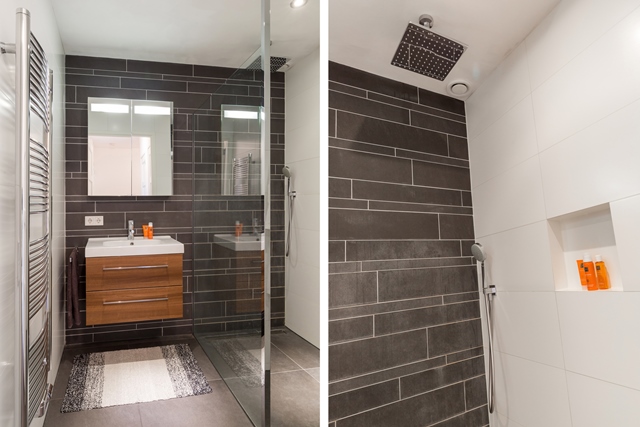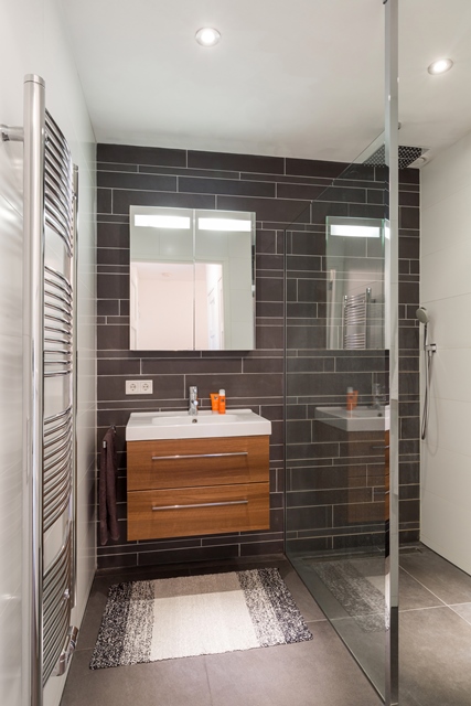 Volledig betegelde luxe badkamer met inloopdouche, wastafel met badmeubel. (Eventueel mogelijkheid voor het plaatsen van een wasmachine en droger)