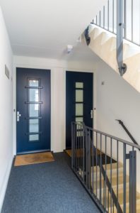 Gezamenlijke entree; ontvangsthal met intercominstallatie, brievenbussen en trappenhuis.