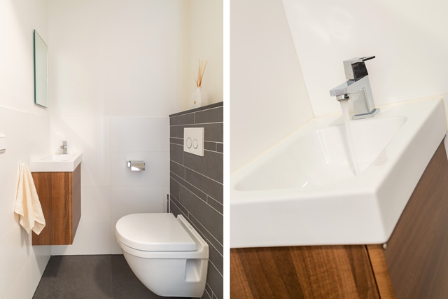 Separaat betegelde luxe toiletruimte met inbouwcloset en fonteintje.