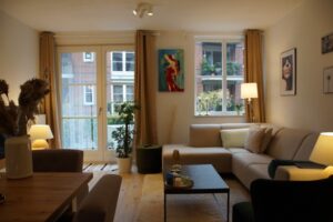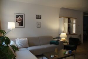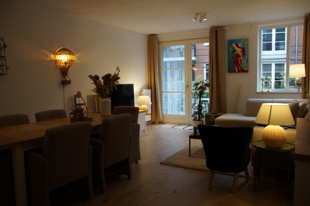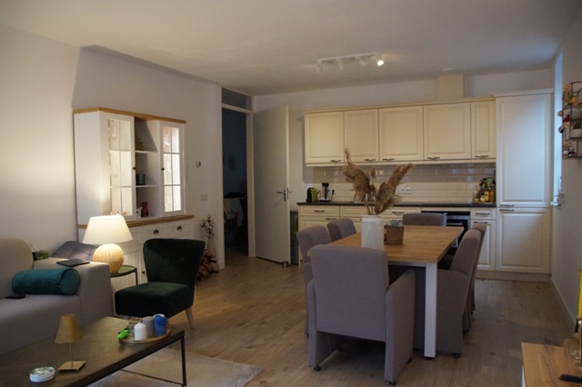Moderne, frisse woonkamer voorzien van een luxe laminaat vloer (doorgelegd in nagenoeg het gehele appartement met uitzondering van badkamer en toilet) Wanden en plafond uitgevoerd in stucwerk.