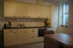 Open keuken met beige keukenblok voorzien van apparatuur zoals: afzuigkap, inductie kookplaat, vaatwasser, koelkast, separate vriezer en magnetron/oven