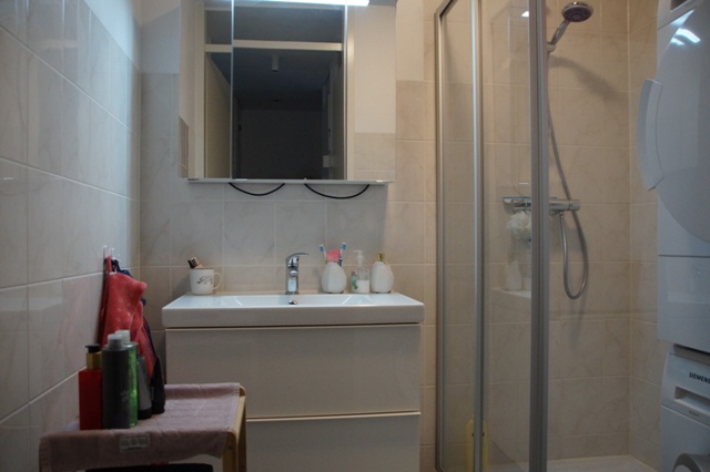Betegelde badkamer met pdouche, wastafel met badmeubel. Aansluitingen voor wasmachine en droger bevinden zich op de badkamer.