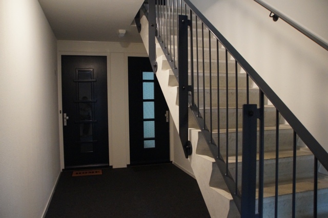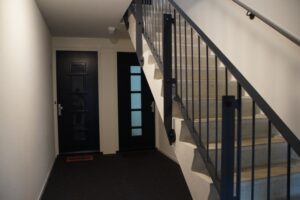 Gezamenlijke entree; ontvangsthal met intercominstallatie, brievenbussen en trappenhuis.