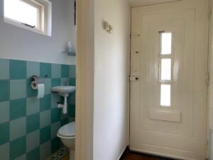 Entree; hal met vaste trap naar verdieping en betegelde toiletruimte met fonteintje.