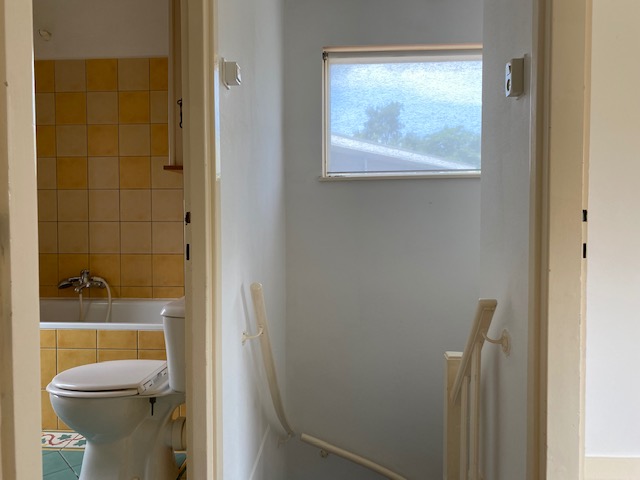 Betegelde badkamer met ligbad, wastafel en 2e toilet.